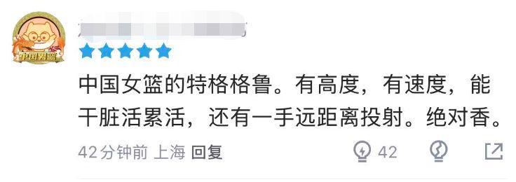 罗欣棫本场的优异表现,也获得了球迷的一致好评,有人称赞她是“中国女篮的特科格鲁”,有高度、有速度、能干脏活累活,还有一手远距离投射。还有人称她是顶级3D。
